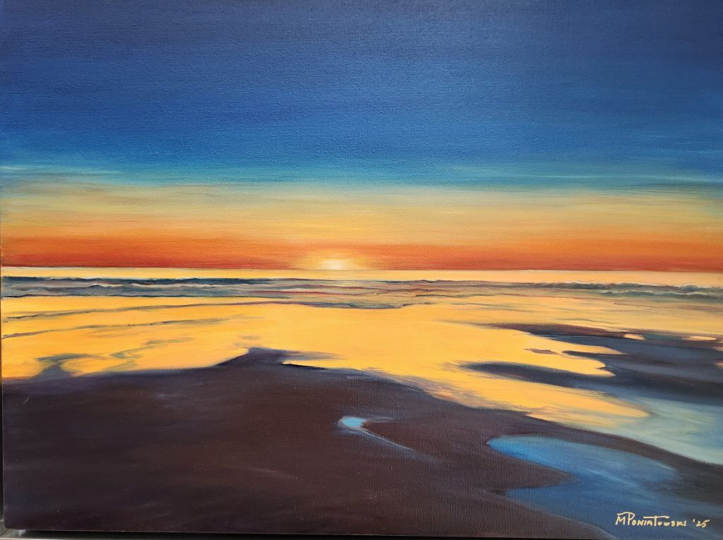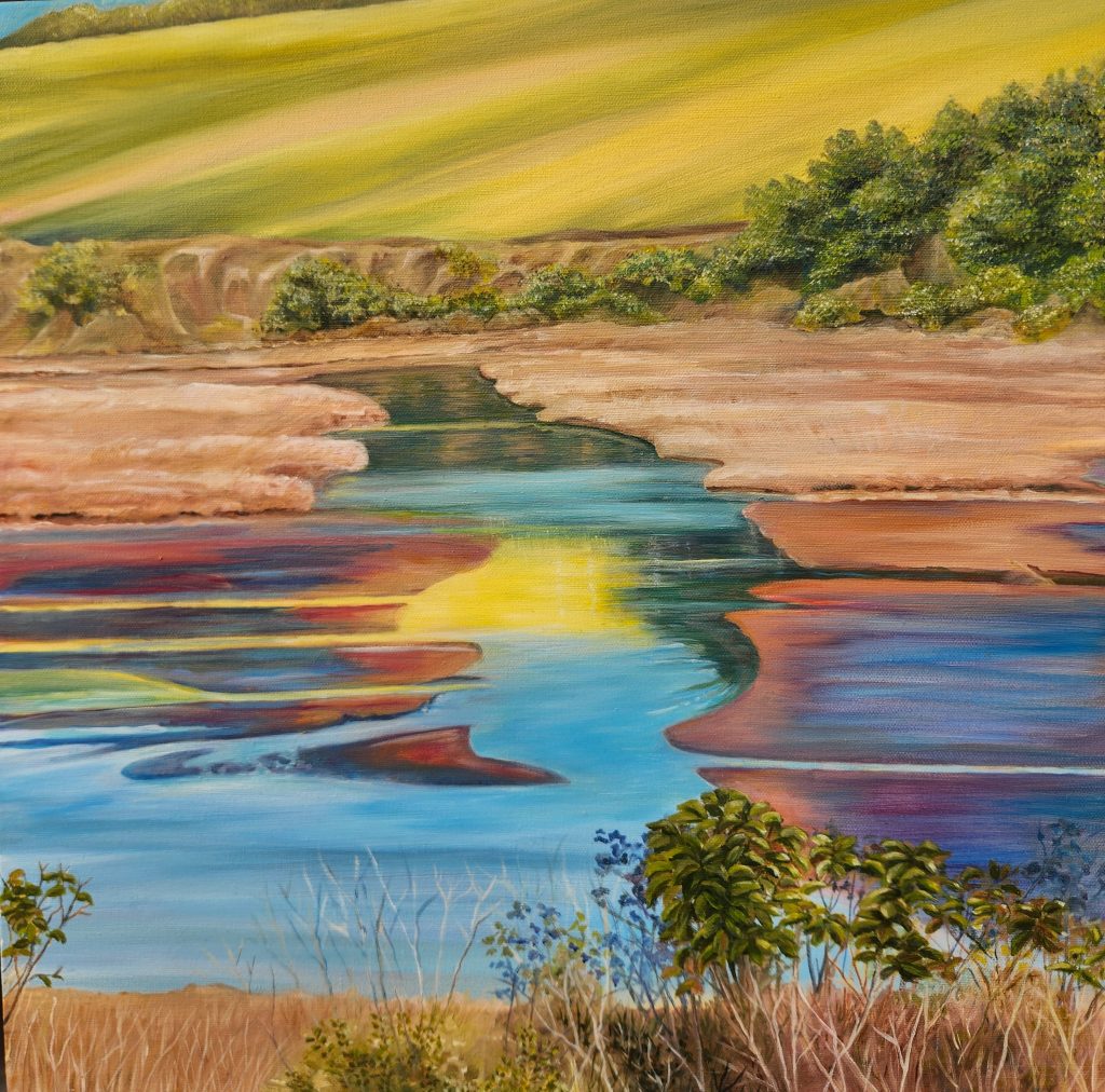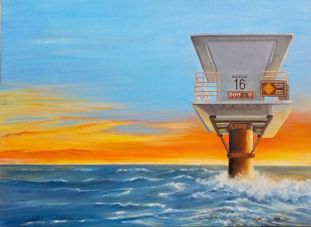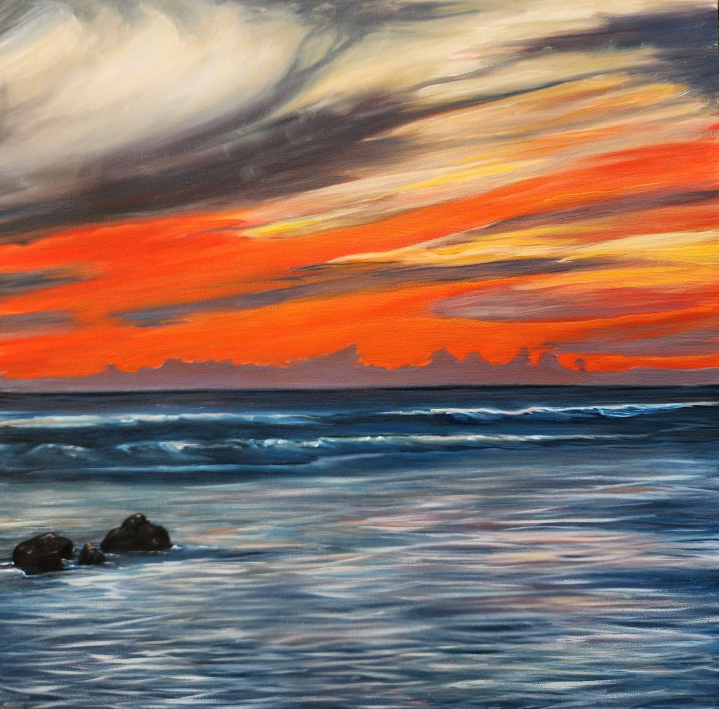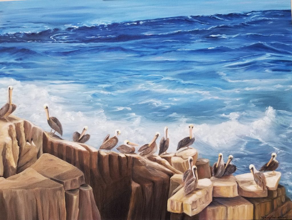Mary has lived in Cardiff for 27 years and has been enriched by the natural beauty she wakes up to every day. Now retired, Mary spends her time painting landscapes inspired by her surroundings. Many of her paintings play with a juxtaposition of a man-made object, set against a striking ocean or sunset. From the walls of her home, her paintings reflect her passion for creating original works of art