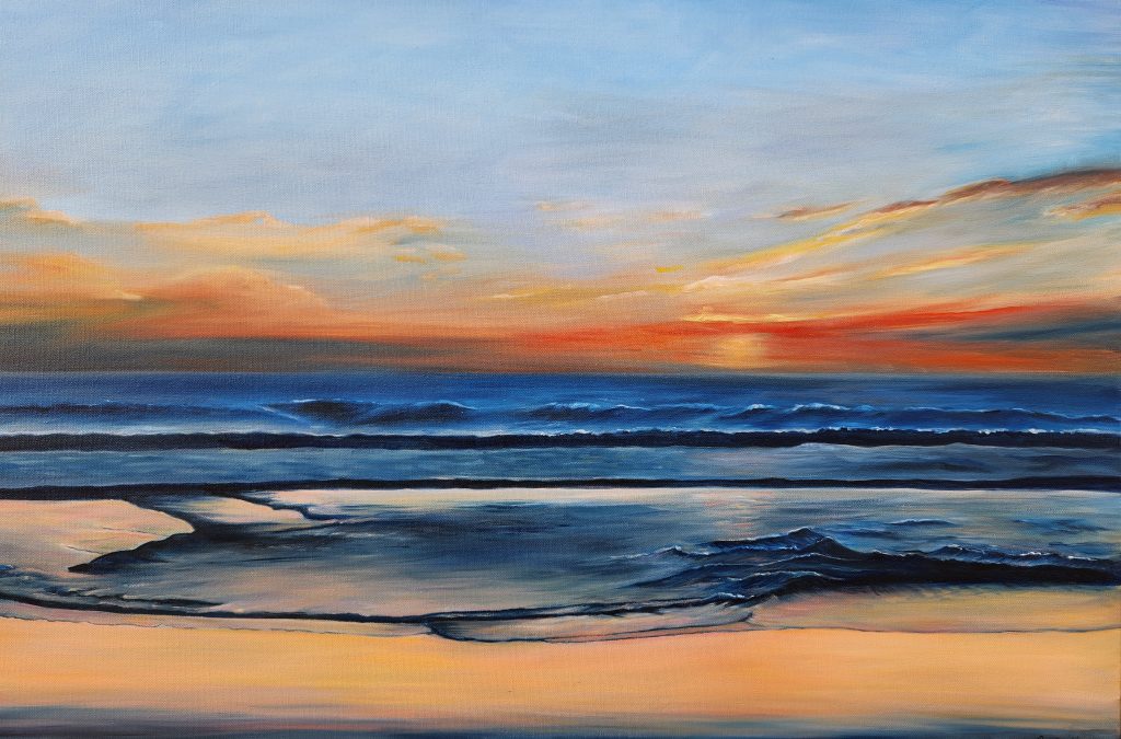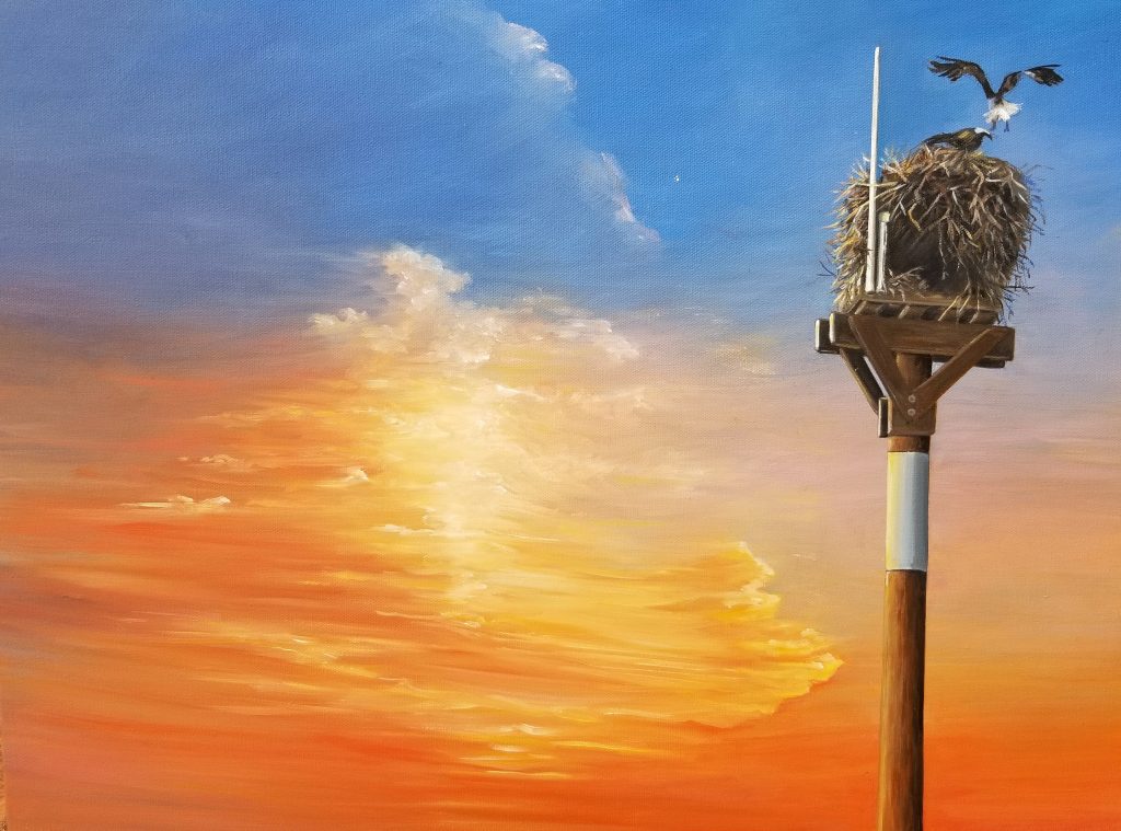 With, my interest in environmental signage or other man-made objects found during my daily walks in Southern California, I begin by photographing various elements I want to see in my painting. I then begin composing my work by placing an object, usually a man-made object into the foreground. If the view of the object I want is not facing west, I will adjust by combining it with an exquisite sunset or beautiful background. The end result is a painting with the viewer looking to the west. Many times I believe that by using this creative process I am able to capture an image that is worth a second look and is more exciting. This current technique gives me the creative outlet to imagine a unique image that would be believable in nature. This technique is more challenging as the artist needs to understand the lighting produced by the background sunset for instance and how it will affect the foreground image to make it look more realistic and having it fit believably in the landscape.